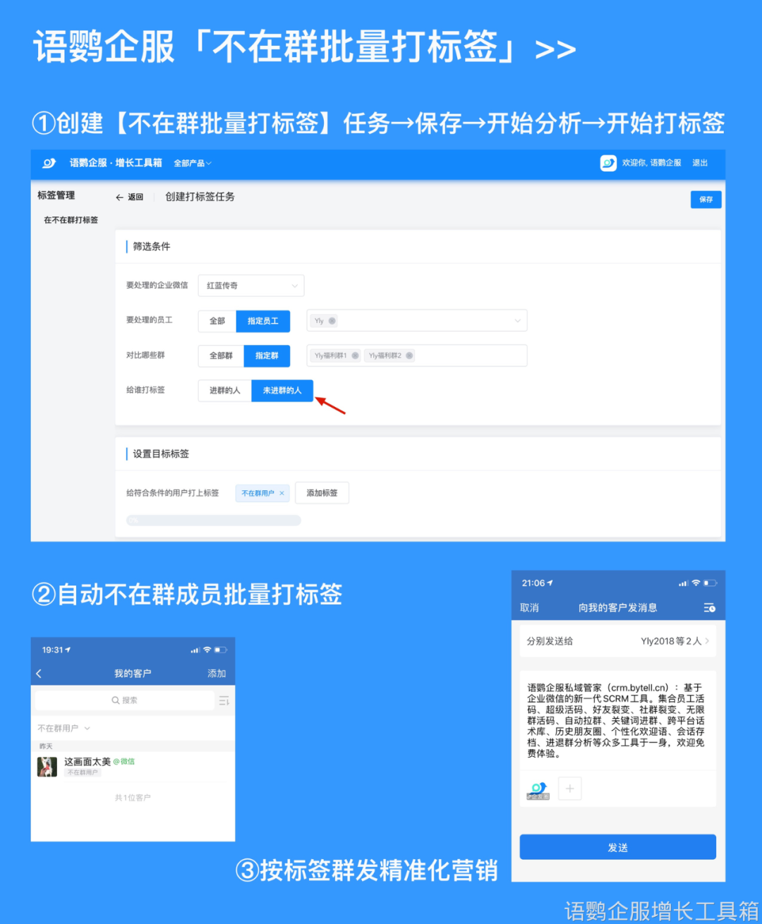 不仅如此,家常菜馆还可以通过语鹦企服的【不在群批量打标签】功能筛选出不在社群的客户并打上特定标签,搭配【定时群发】功能即可轻松实现私域的精准化营销。