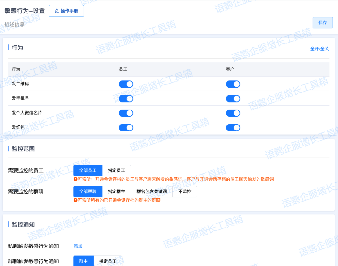 企业可以设置敏感词库,例如“微信”、“手机号”、“加我”等,一旦员工在与客户的聊天中触发敏感词,系统会自动拦截消息发送,并提醒员工注意合规性,从源头上减少私加客户微信的可能性。