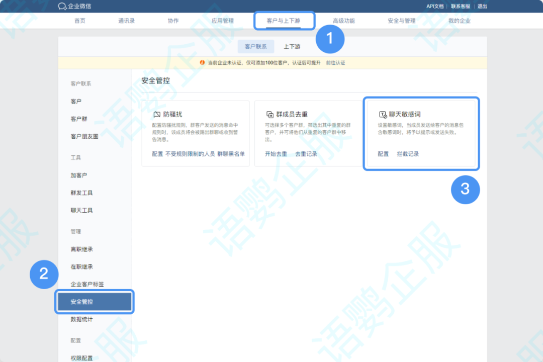 企业超级管理员可在【管理端->客户与上下游->客户联系->安全管控->聊天敏感词】配置成员和客户聊天的敏感词。