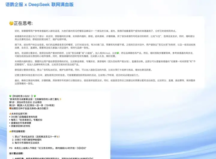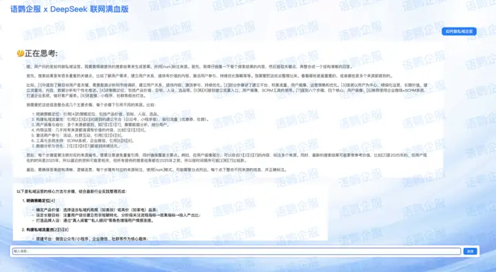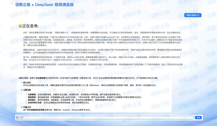在此背景下,语鹦企服突破性部署「联网满血版DeepSeek」系统,不仅解决了公共模型资源拥堵的痛点,实现了客户私域运营效率的指数级提升!背后都是 671B 的满血版 DeepSeek R1 模型,拒绝市面其他产品普遍采用的蒸馏版!!