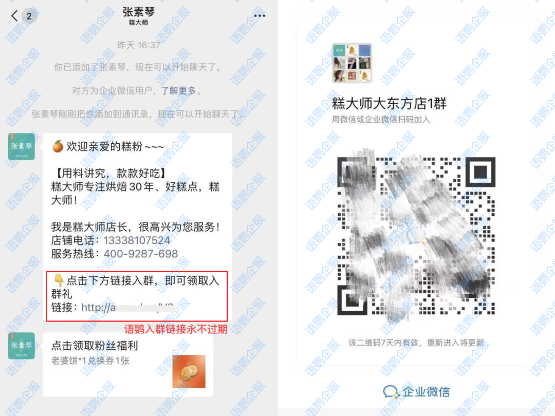 糕大师通过【员工活码】创建了引流二维码进行线上与线下的投放。当用户扫码添加时,系统不仅自动通过好友,还会向用户推送欢迎语与社群链接,通过粉丝福利吸引用户加入社群,巧妙实现私域多级留存。