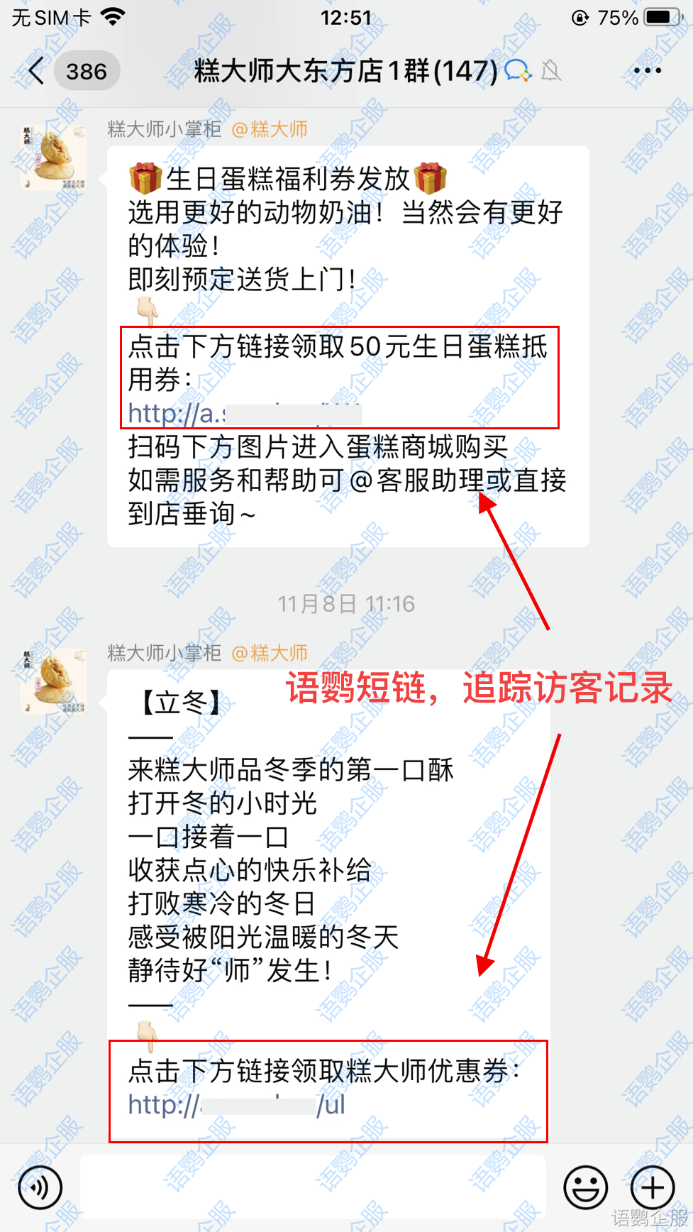 用户进群后,糕大师还通过日常发送领券链接、秒杀链接持续活跃社群,并通过【语鹦短链】实现了访客记录追踪,便于糕大师等企业更快掌握用户情况并进行跟进。语鹦短链不仅支持将长链接进行缩短,让文案更加简练,还支持定时、满人及满量换链,通过链接切换分流拦截长尾流量。