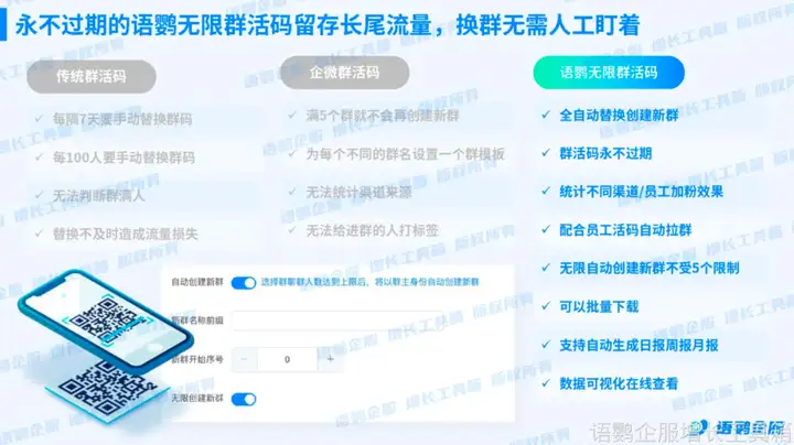 想要真正实现群二维码“永久有效”,你需要借助更强大的工具。语鹦企服的【无限群活码】功能,可以真正意义上地实现“永久有效”。