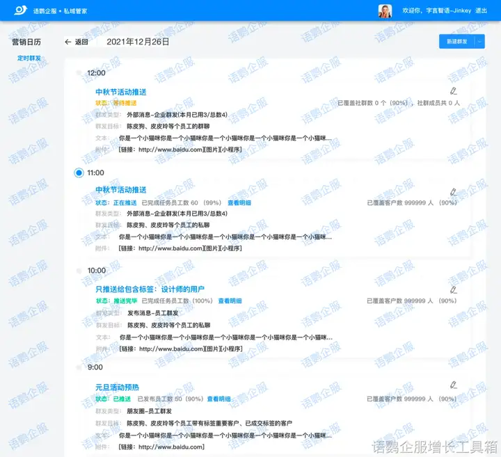 同时企业还可以使用语鹦企服的【定时群发】功能,让员工提前做好内容规划,将30天内需要发送的消息提前设置好发布时间、发送群组,定时发布,实现群高效自动化运作。