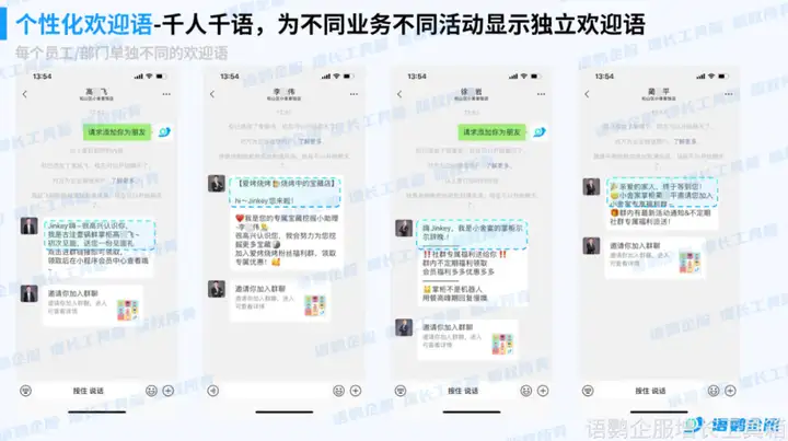 语鹦企服的【个性化欢迎语】功能,可根据不同员工、不同部门等设置不同的欢迎语,实现精准营销。也可插入客户昵称、产品信息等变量,让欢迎语更具个性化和亲切感。