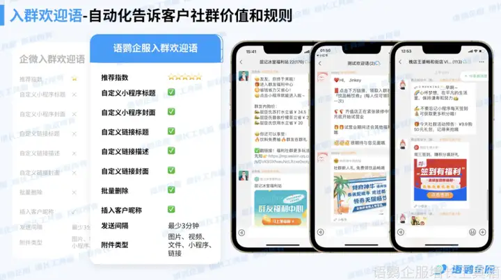 除了设置群机器人,企业也可以使用语鹦企服的【入群欢迎语】功能,设置客户进群后自动发送欢迎语。语鹦企服的【入群欢迎语】功能支持自定义欢迎消息,包括小程序标题、封面、描述等,让管理员能够以更个性化的方式欢迎新成员,并在用户入群的第一时间自动发送,缩短首次回复时长,提升用户对社群的关注度,最终助力营销转化。