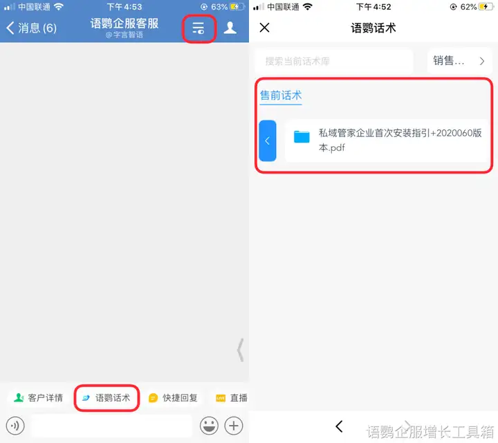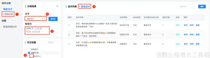 如果想补发欢迎语,企业可以借助企业微信的第三方工具,比如语鹦企服的【话术库】功能,新建话术,配置到企业微信到聊天工具栏。