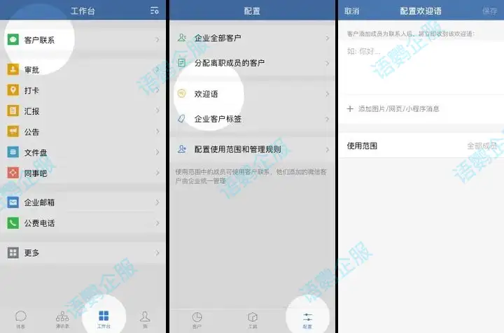 首先,需要确认是否在企业微信后台开启了欢迎语功能。操作路径: 登录企业微信管理后台 – 我的企业 – 客户联系 – 配置 – 欢迎语。如果是配置了欢迎语,还是没发送的话,要看看是不是该企业微信不在欢迎语的配置范围。