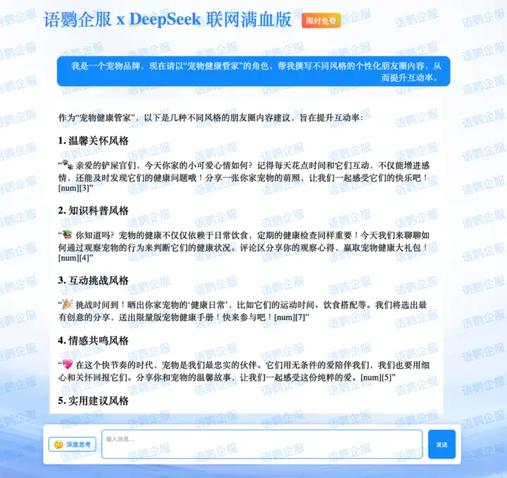 比如,一个宠物品牌可以利用「语鹦企服DeepSeek满血版」,以“宠物健康管家”角色生成了不同风格的个性化朋友圈内容,从而提升互动率。还将日常互通与语鹦企服的跨平台话术库功能完美结合:将AI生成的内容预设到话术库中,客服人员就能快速调用,实现千人千面的个性化沟通。