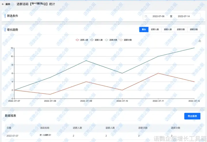 除此之外,【无限群活码】还支持自动生成日报、周报、月报,清晰统计进群人数、退群人数、进群次数、退群次数等运营数据,将不同渠道/员工加粉效果可视化,更便于企业随时了解私域营销与运营效果,及时调整私域运营策略。