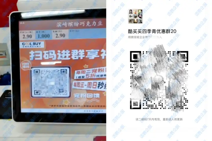 以连锁零食店酷买买为例,酷买买通过语鹦企服的【无限群活码】能创建引流社群二维码投放在收银机上,并配上扫码进群享礼品、周二宠粉日、周三至周日秒杀等营销活动的信息,在收银环节快速吸引客户注意力,将客户引流至企业私域,提升客户对品牌的忠诚度,促使客户再次进行复购。