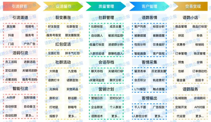 飞书深度集成字节系应用,例如抖音电商、火山引擎等,并提供开放API支持自定义工作流。企业微信则整合了腾讯生态,例如微信支付、小程序、腾讯云等,并且拥有更丰富的第三方应用市场,其中,语鹦企服作为企业微信官方服务商,就为企业提供了从获客、促活、留存、转化一站式私域流量运营解决方案。
