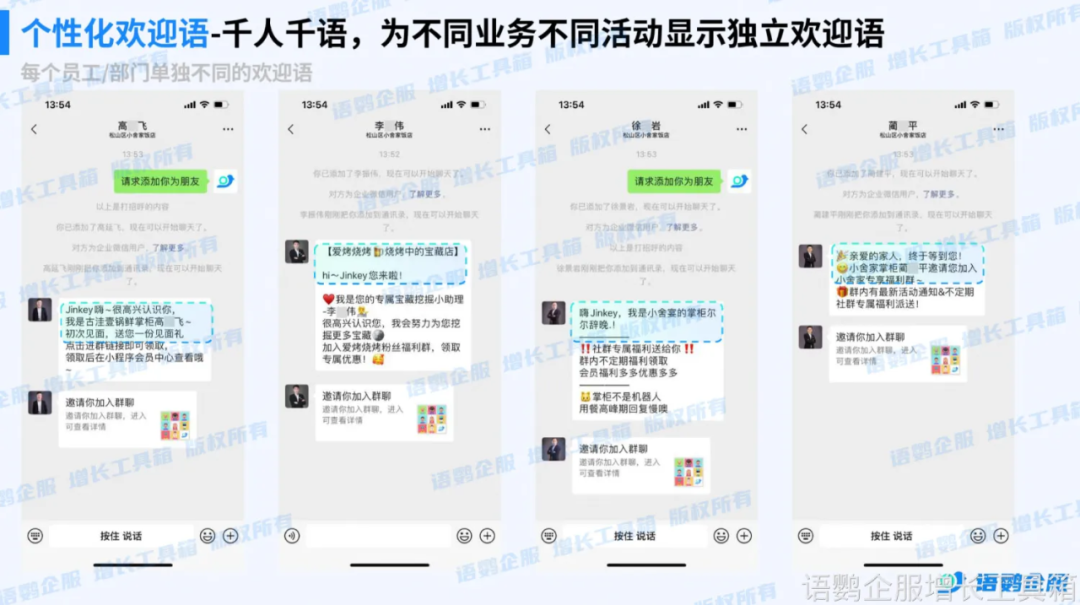 针对外部联系人首次添加的场景,企业可以通过语鹦企服「员工活码」或「个性化欢迎语」设置加好友自动回复,当外部联系人第一次添加企业成员时,会自动收到预设的欢迎语内容,支持文字、图片、入群邀请链接等形式。