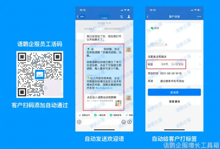 企业可以通过线上线下多种渠道引流,例如,利用语鹦企服的活码工具,将客户从公众号、线下门店、广告等渠道引流到企业微信,自动发送欢迎语并自动打标签,并通过不同的活码参数区分客户来源,为后续的精细化运营做准备。