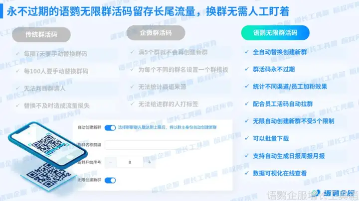 想要突破人数限制,更灵活地管理社群,推荐使用语鹦企服的「无限群活码」功能。它没有人数限制,可以持续引流,无需担心二维码失效问题。更重要的是,「无限群活码」支持自动建群,当所有备用群满员后,系统会自动创建新群,确保用户始终可以扫码进群。