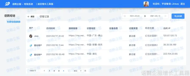 企业如果需要更深入的客户互动数据分析,例如平均回复时长、首次回复时长、访客记录等,可以借助语鹦企服的「互动指标」和「社群链接跟踪」功能。