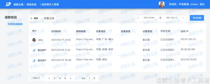 我们可以借助语鹦企服的「社群链接跟踪」功能,统计不同社群的专属链接被打开的次数,以此来辅助评估不同产品链接的点击率、转化率,并查看链接访客记录,指导后续的销售优化。可以判断哪些渠道更有效地触达了目标用户,并进行相应的资源倾斜。