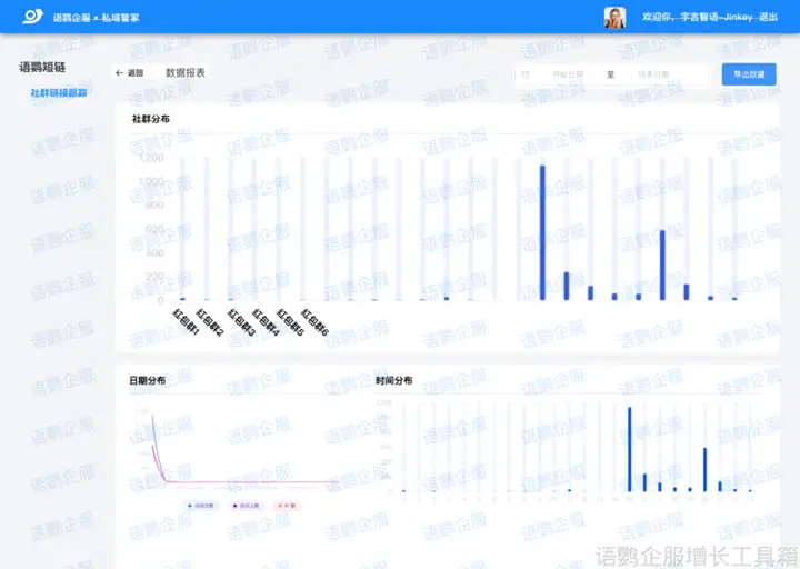 用户来了又走,社群就成了“漏斗”,难以积累价值。语鹦企服的「进退群留存分析」功能可以追踪不同时间段内,例如日留存、周留存、月留存等,社群的进群人数和退群人数,以及新用户的留存率变化趋势,帮助我们更好地了解社群用户的生命周期。通过分析这些数据,我们可以识别哪些阶段的用户流失率较高,并针对性地进行干预。例如,如果发现新用户次日留存率很低,就需要反思入群欢迎语、新人引导、首日活动等环节是否足够完善,并进行相应的优化,提升用户的初期体验,从而提高用户留存率。
