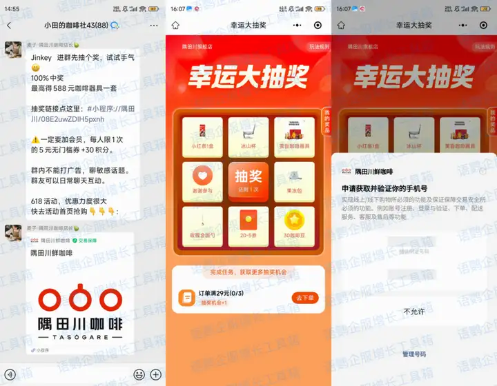 用户进群后,隅田川咖啡会让用户参与一个抽奖活动,抽奖的时候会授权手机号登录,这样可以打通公域手机号和私域UnionID,做到全域用户统一画像,方便做精准营销。