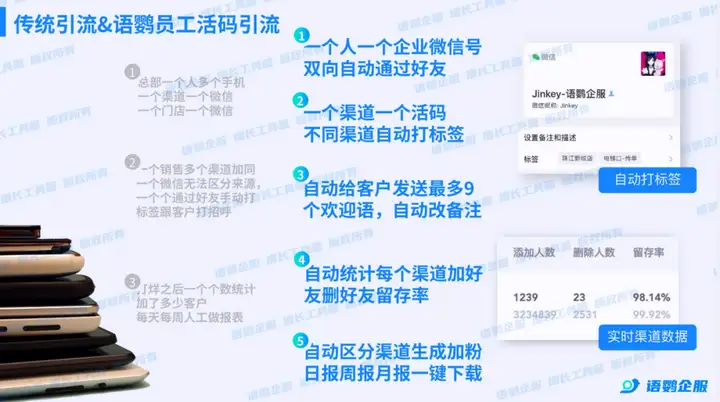 获取阶段的核心目标是将公域流量高效转化为私域用户。语鹦企服的员工活码功能支持多渠道活码创建,能够自动分配客服、设置个性化欢迎语和自动打标签。通过不同渠道的员工活码,企业可以清晰地追踪用户来源,并根据渠道特性提供差异化的接待服务。