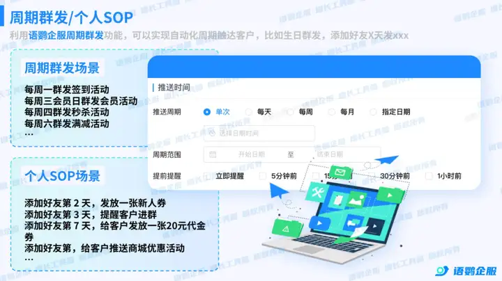 个性化触达与自动化运营则是SCRM发挥效果的关键执行环节。语鹦企服的定时群发功能能够根据客户标签和行为数据,自动向不同群体推送个性化内容。对于高价值但近期活跃度下降的客户,系统可以自动触发专属福利推送;对于新加入的客户,可以设置个人SOP自动化欢迎序列,通过连续的价值内容建立信任关系。系统还能够通过好友重复提醒、被删提醒等功能及时发现客户流失信号,让企业能够第一时间采取挽回措施。