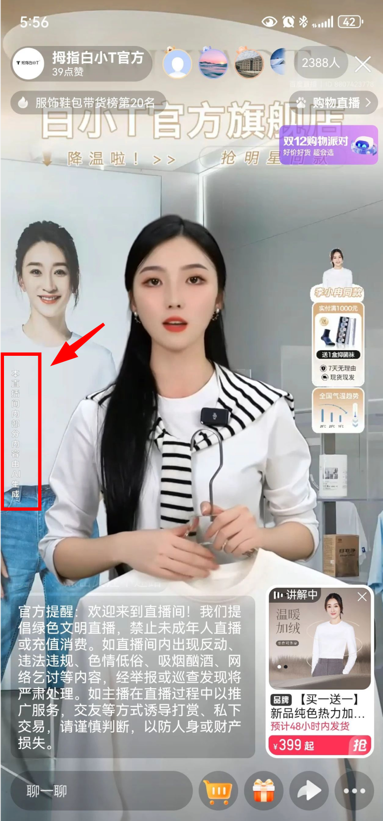 “互动”是“白小T”能够快速促单的有效手段,通过频繁呈现产品卖点与外观,数字人能够详尽地介绍衣服特点和卖相,这是“白小T”能够让用户持续留存的关键。同时数字人与真人的直播互动,更是打开了电商展示的另一种方式,对于追求新鲜的用户来说是非常有力的引流手段。虽然依靠脚本来机械运作,但商家可以通过图片辅助或是真人协同的方式,来提升直播间消费者的参与感。