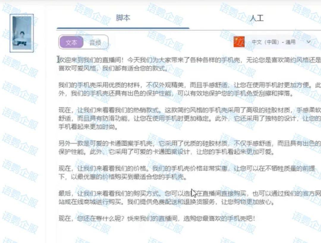 语鹦企服的脚本有AI生成和音频输入两种形式。想要节省时间,在修改上消耗低精力的,便可利用AI技术来编写脚本;而想要在文本中植入众多产品信息点以及独到的话术,便可使用音频输入转写的方式。无论哪一个,都可以帮助商家提升脚本输出的效率。