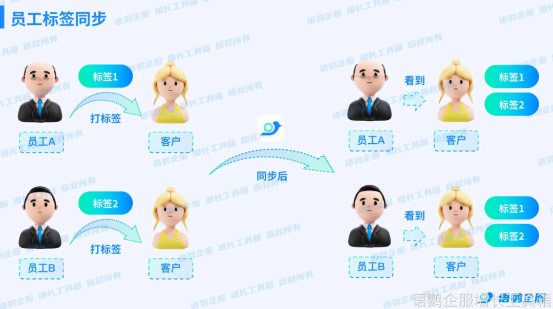 除了事后监管,事前防控同样重要。机构可以通过企业微信的权限管理功能,限制员工添加客户的权限,所有客户联系都必须通过官方渠道进行。同时,利用语鹦企服的员工标签同步功能,确保同一客户的信息在不同员工间实现共享,避免信息壁垒为私单创造条件。