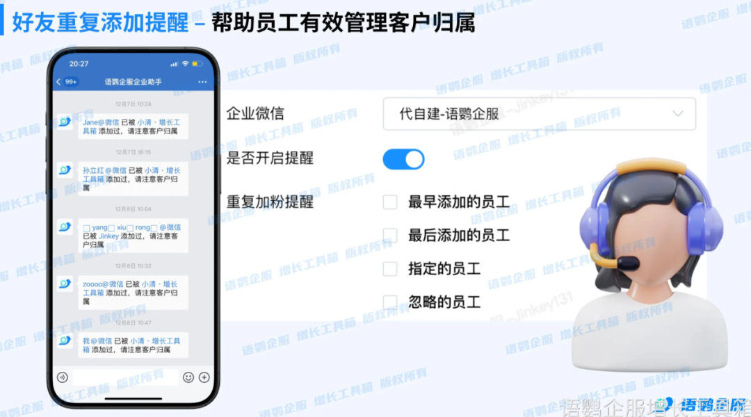 配合标签管理功能,企业还可以根据客户标签、区域、消费能力等维度智能匹配接替人员。好友重复提醒功能则能避免同一客户被多个员工重复添加,从根源上杜绝资源混乱。