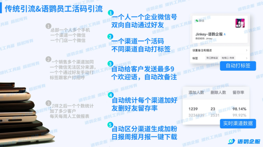 全链路优化需要数据驱动。语鹦企服的数据报表中心能清晰呈现每个环节的转化漏斗,某职业教育机构通过数据分析发现,添加企微后48小时内未收到个性化消息的用户流失率高达65%,优化欢迎语策略后,留存率提升至82%。