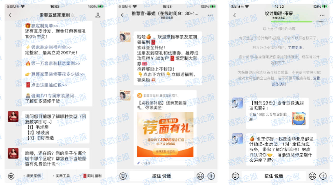 索菲亚社群活动丰富,实拍案例、经验分享、抽奖直播兼具,用户粘性较强。大促时采用”门店+私域+明星”组合拳,曾创下单场直播2165万销售额的记录。这种线上线下深度打通的模式,正是低频高客单行业私域运营的精髓。想复刻这一模式的品牌,可使用语鹦企服的好友裂变功能,通过阶梯奖励激励老带新,让私域流量池实现自增长。