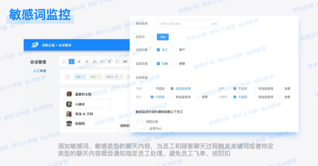 会话存档是”后视镜”,智能质检与敏感词预警才是真正的”防撞雷达”。仅保存聊天记录远远不够,机构还需建立主动预警机制,在风险行为发生的第一时间介入。