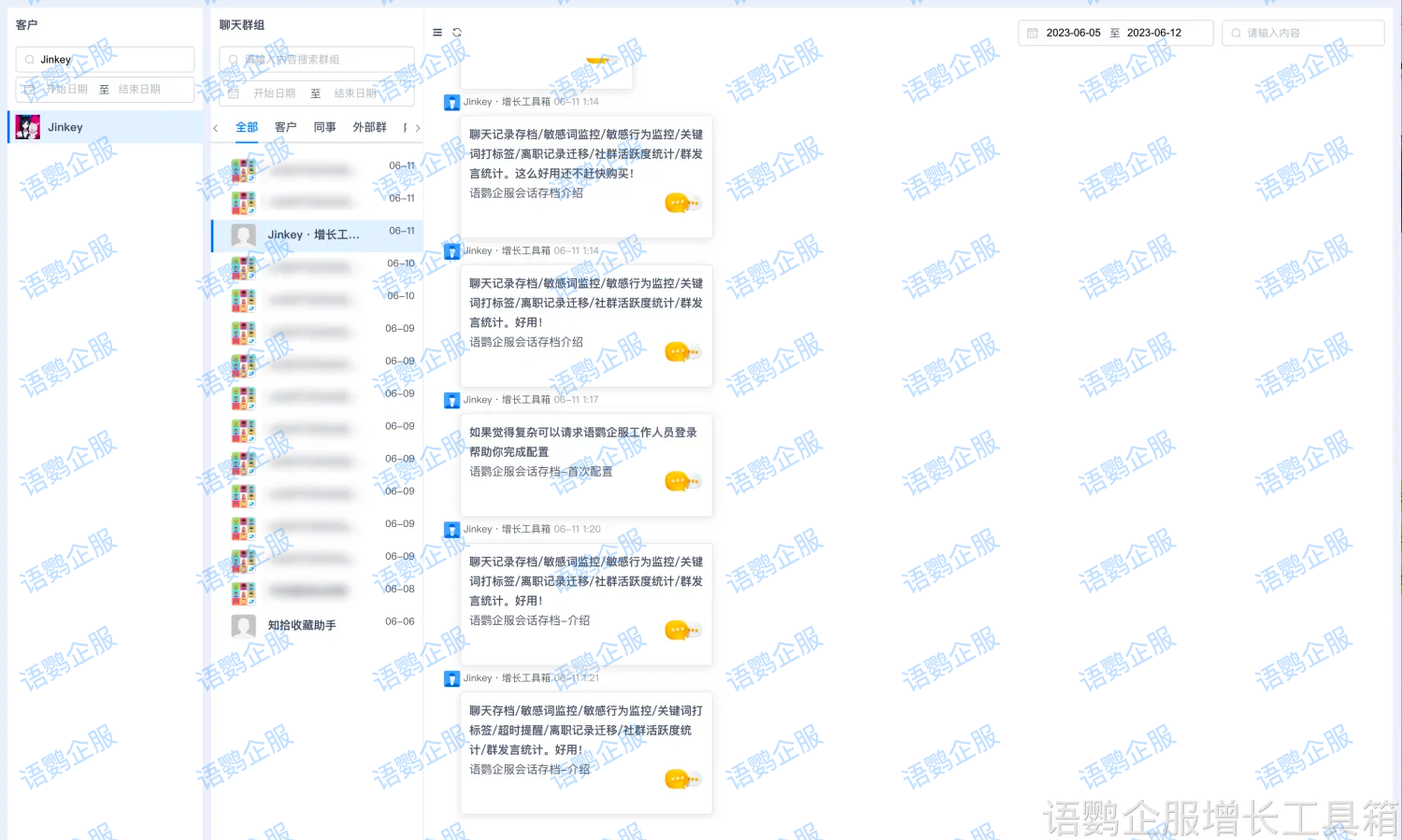 通过语鹦企服的会话存档功能,管理者可以永久储存聊天记录,并按时间、人员、关键词等多维度条件检索。当客户纠纷发生时,完整记录能够还原事件真相;当需要复盘话术时,优秀案例可以快速提取分享。语鹦企服还支持为不同员工设置差异化查看权限,既保障管理需求,也维护必要的信息边界。
