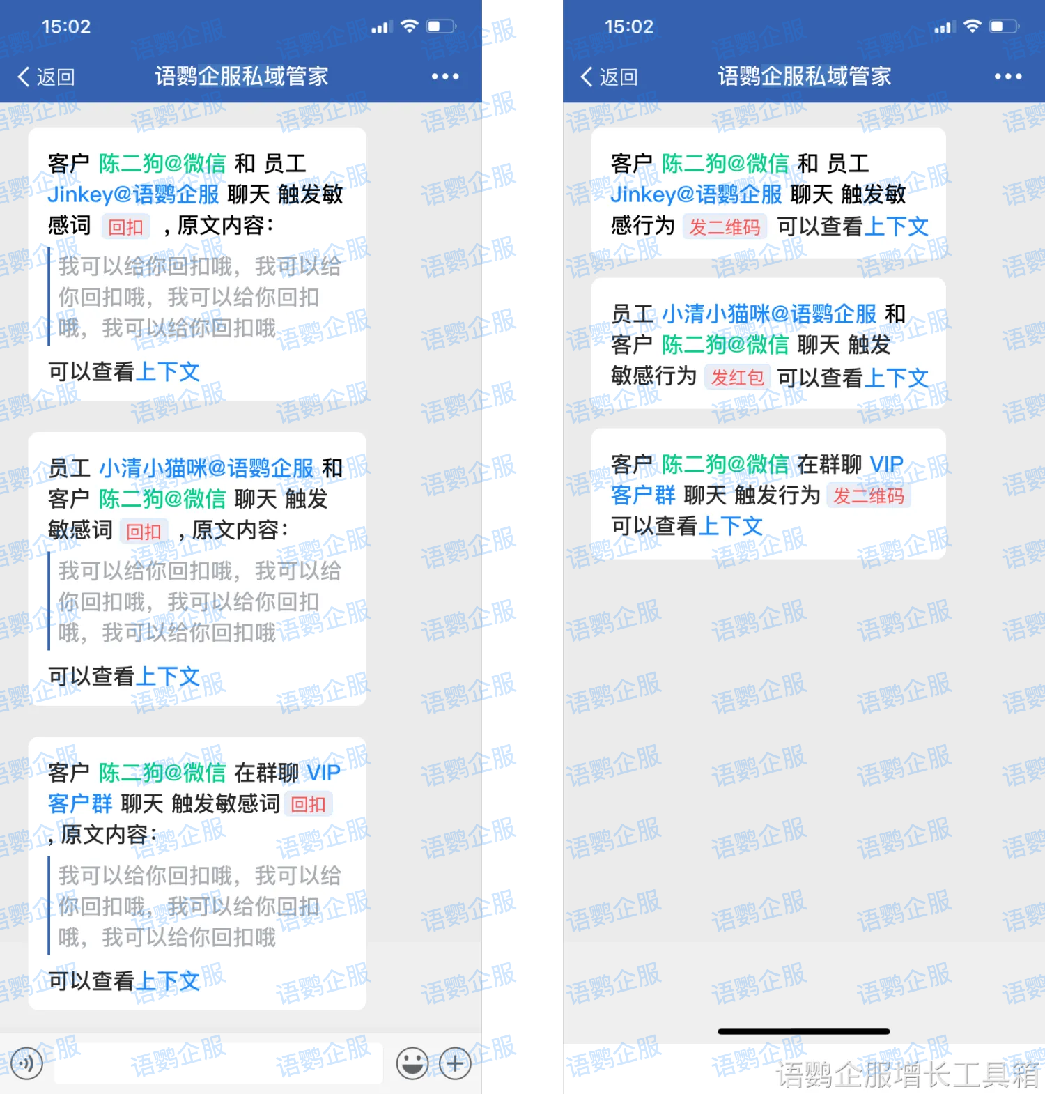 敏感词监控是最有效的预防手段。管理员可以自定义设置违规敏感词库,将”私人微信”、“线下转账”、”私下交易”等高风险词汇纳入监控。当员工触发这些敏感词时,系统会立即向管理员发出预警。语鹦企服支持敏感词智能检测,即使员工事后删除或撤回消息,后台依然会留存记录。