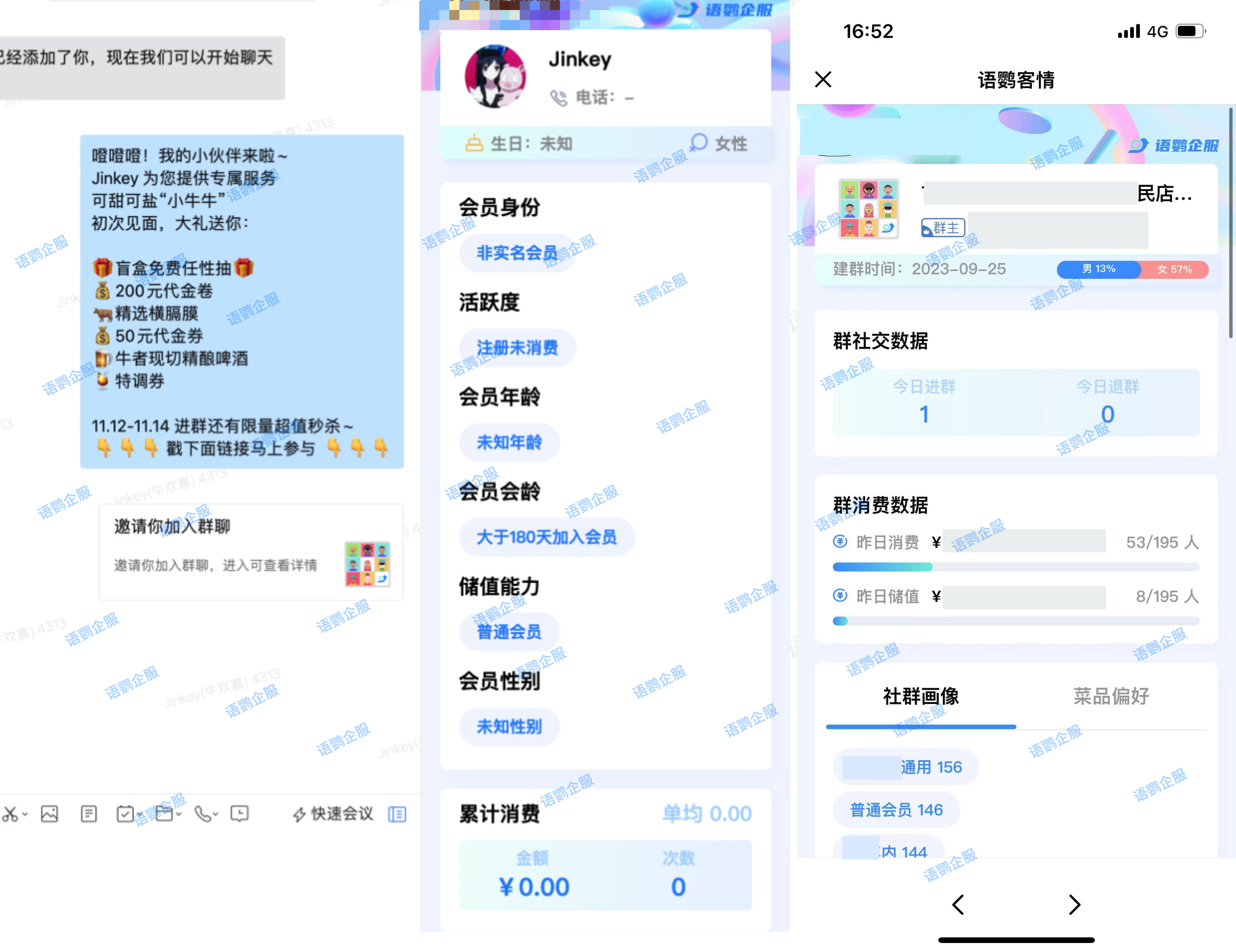 借助企业微信,门店可以在客户结账时通过员工活码引导添加好友,自动为客户打上来源标签和消费偏好标签。语鹦企服的客情侧边栏功能支持多维度记录,比如消费金额区间、购买品类、到店频次等,让每个客户都有清晰的画像。有了客户画像,运营就有了抓手——购买过母婴产品的客户,在宝宝满月、百天等节点推送相关优惠,转化率远高于无差别群发。