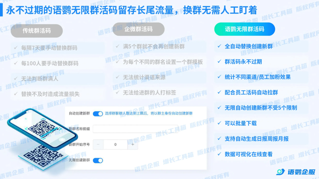 社群运营常受困于入口拥堵与留存粗放,线下物料投放时群二维码七天过期或满200人无法扫码进群的尴尬屡见不鲜,导致昂贵流量白白流失。破解这一难题需构建永不掉线的流量承接系统,利用语鹦企服的无限群活码功能,企业可创建永久有效的二维码,突破原生群活码只能关联5个群的限制,在群人数达上限后自动创建新群,实现全天候无人值守的自动化拉新 。这对瑞幸咖啡、屈臣氏等拥有高频大流量需求的品牌尤为关键。