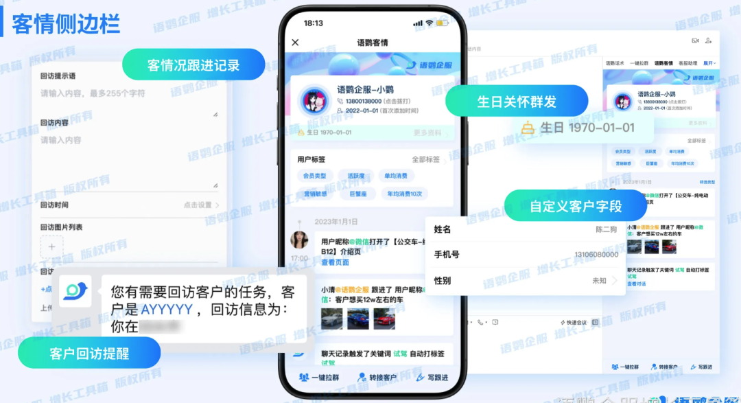 除了实时的归属权预警,提升管理效率的关键在于打破数据孤岛。借助UnionID机制,语鹦企服协助企业跨越公众号、小程序等不同触点识别同一个用户,将看似独立的行为关联为立体的客户画像 。这意味着销售在跟进时,面对的不再是冷冰冰的昵称,而是带有丰富标签和行为轨迹的完整视图。