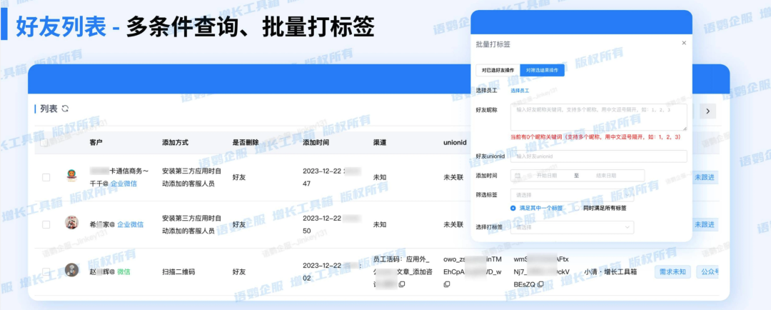 借助语鹦企服的标签管理与好友列表功能,管理者可有效打破部门壁垒 。通过后台统一标签组权限,企业能规范全员标签语言,确保标准统一 。同时,好友列表提供的全局视角允许管理者跨越单个员工局限,根据特定标签精准筛选全公司目标客户群 。这种透明化共享机制,让推广、销售与客服等不同节点员工都能基于同一套实时更新的客户认知体系行动。当标签从个人私藏转变为组织共同资产,信息孤岛便自然消融,各部门在统一数据驱动下协同作战,从而真正释放私域流量的复利价值。