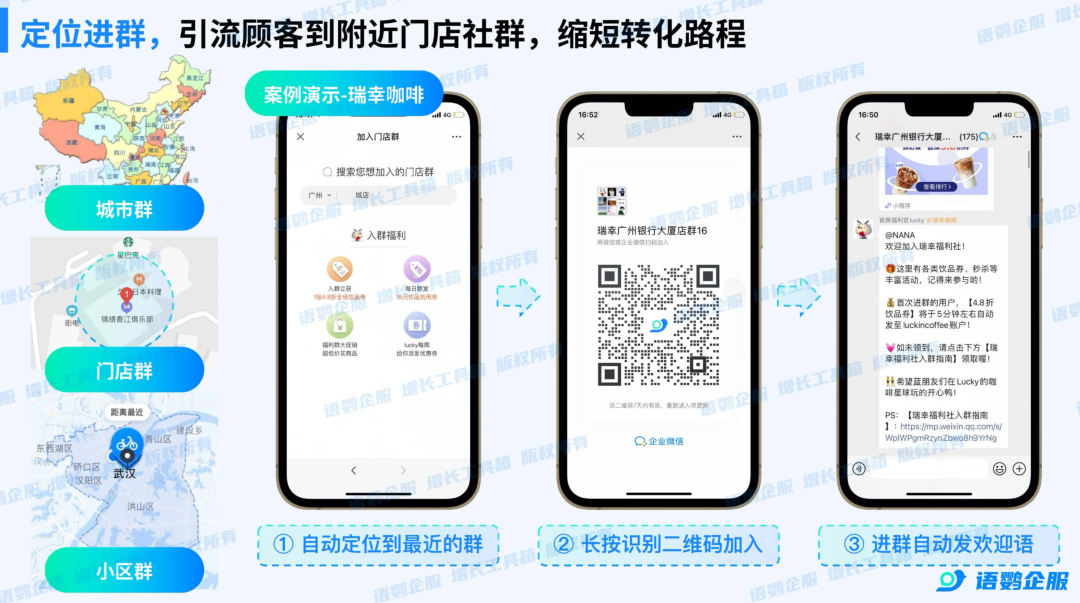 在实际应用中,这种方式能实现“千人千群”的精准导流 。例如,定位进群功能可识别客户位置,将其引导至距离最近的门店专属群 。这不仅解决了传统群码容易满员、过期的痛点,更让客户在扫码瞬间就获得本地化的专属感 。这种基于身份与地理位置的精准匹配,是目前私域转化最高效的手段之一 。