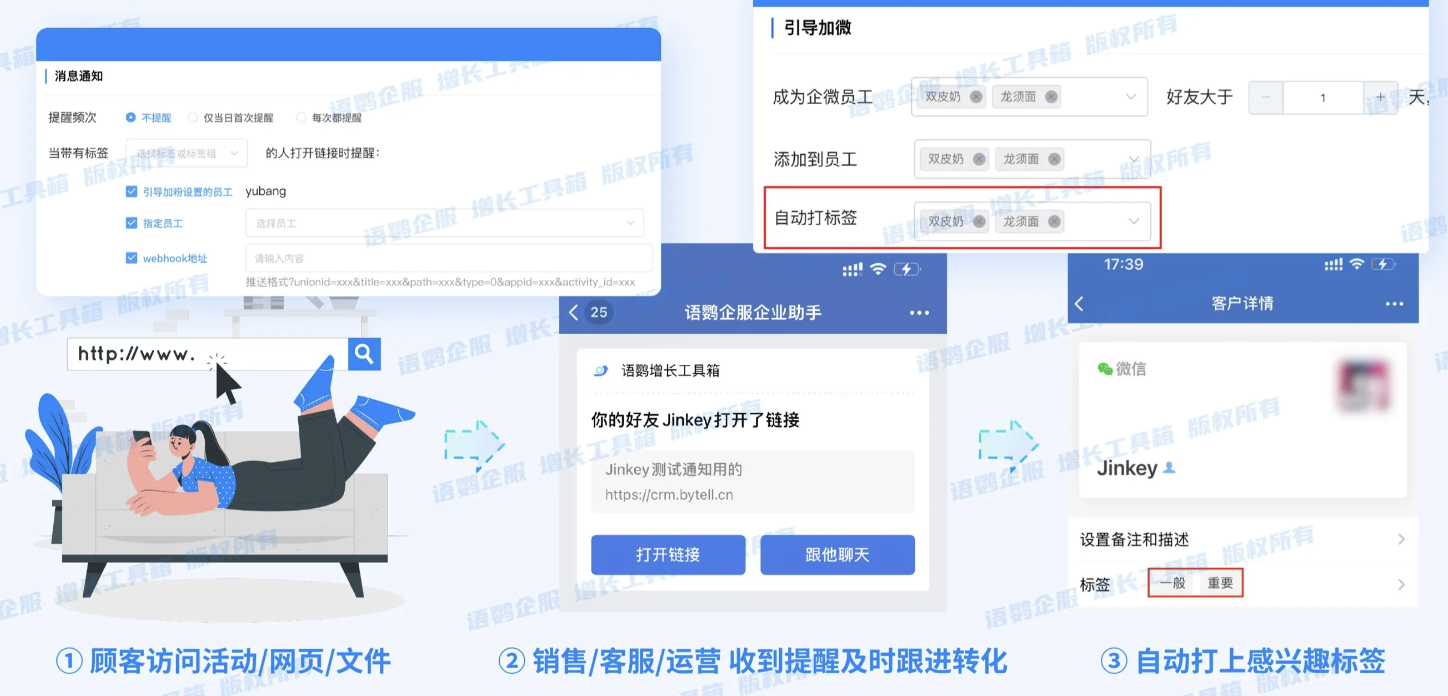 以上就是关于《企业微信雷达如何精准追踪客户点击行为?语鹦企服怎样助力实现高效客户洞察?》的相关内容了。通过轨迹素材捕捉实时行为,配合自动标签动态完善画像,再结合表单深度沉淀数据,企业能有效提升线索转化效率。更多企业微信私域玩法,欢迎关注语鹦企服私域管家。