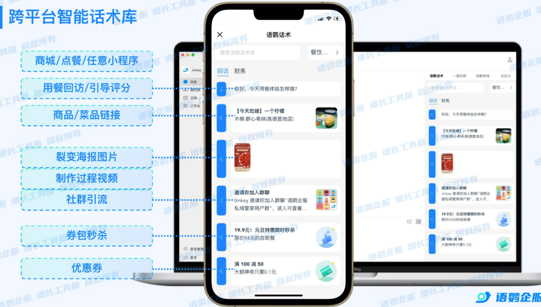 引流只是开始,如何高效承接海量咨询并保持服务标准是管理的难点。面对员工流动性大、新人上手慢的问题,借助语鹦企服的跨平台话术库,企业可将金牌话术、常见问答及营销素材统一入库,内嵌至企业微信聊天侧边栏 。员工沟通时,只需点击即可一键发送图文、小程序或海报,既确保了品牌对外口径的一致性,又极大缩短了响应时间,让单兵作战效率倍增 。