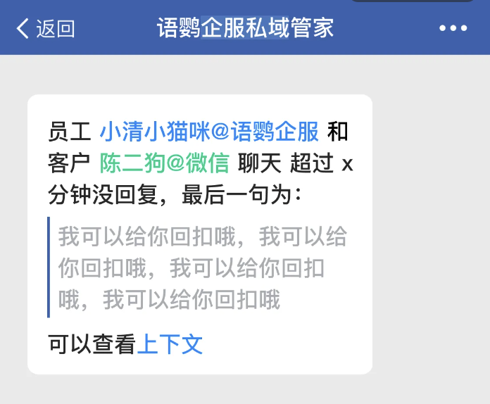 以上就是关于《怎么防止客服回复不及时被投诉?企微超时回复提醒功能怎么开?》的相关内容了。通过智能客服分流、专业话术支持以及严格的超时预警机制,企业可以彻底告别回复延迟带来的客户流失与客诉风险。更多企业微信私域玩法,欢迎关注语鹦企服私域管家。