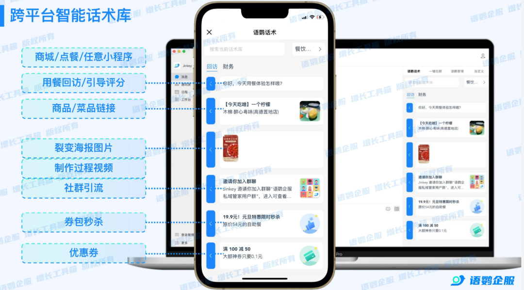 处理社群顾客咨询是另一大痛点。若依赖手动打字回复,效率低且标准不一。通过引入语鹦企服的跨平台话术库,店长可预设标准的图文、视频或小程序素材当顾客提问时,员工在侧边栏一键即可发送专业回复,大幅提升响应速度并塑造品牌专业形象这种标准化的服务加深了顾客对门店的依赖,建议立即体验语鹦企服私域管家SCRM系统的便捷。