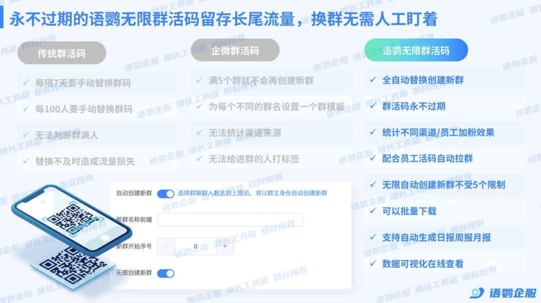 线下引流常面临二维码过期或群满人的损耗。企微原生群码有效期短且满人后需手动更换物料,不仅流失流量更损害体验语鹦企服的无限群活码生成的二维码永久有效门店只需在海报或台卡上印刷一次,无需频繁更换物料,极大节省了成本与维护人力,让每一滴公域流量都能沉淀。