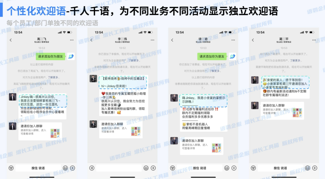 解决完添加好友的问题,紧接着要面对客户的第一印象管理。欢迎语是私域运营中至关重要的“微漏斗”,直接决定客户接下来的交互动作。企业微信原生欢迎语只能全局统一设置,资深顾问和售后客服发送相同模板极易让人设崩塌通过语鹦企服个性化欢迎语功能,企业彻底打破桎梏,管理人员可以精细化地为不同部门甚至具体员工配置截然不同的欢迎语内容。