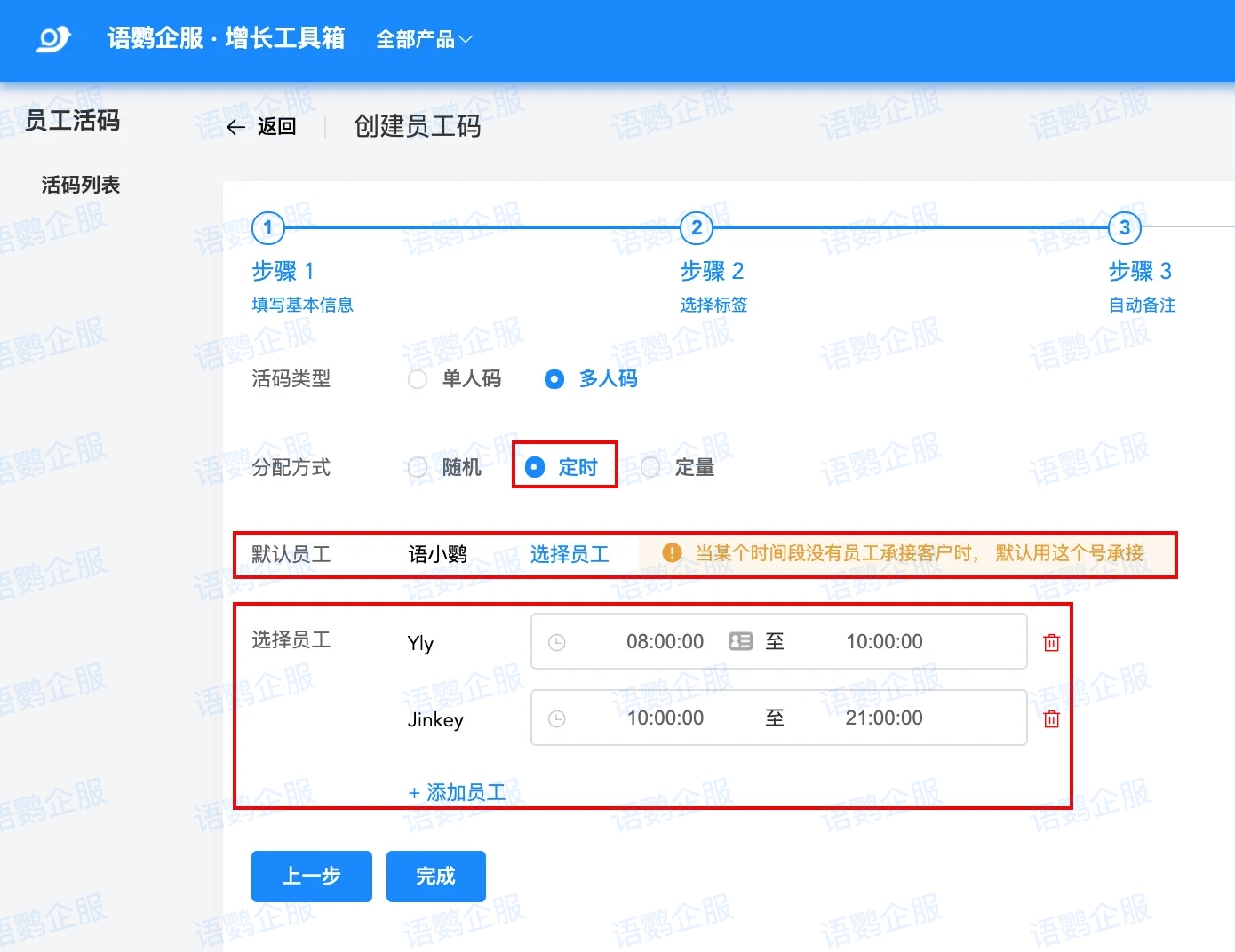 随着全渠道获客成本不断攀升,教培与餐饮等行业普遍存在单号添加好友极易受限、夜间高意向流量流失等挑战。这些问题导致高昂的广告投放费用打水漂,成为企业微信私域运营人员所需要解决的问题。下面就跟着语鹦企服来看看:一个码怎么分配给多个销售?超级活码分时段接待功能怎么用?