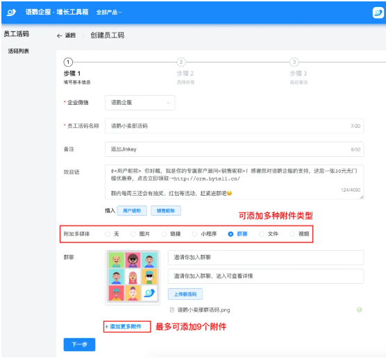 在展台接待台或派发的传单上印制专属活码,后台可配置多个员工进行随机分配,完美避开单号限流尴尬。客户扫码添加企微后,系统会瞬间触发个性化欢迎语,最多支持配置1条文本加9个附件。比如当客户加入某参展品牌的企业微信,立刻收到带有展会专属电子画册和小程序的欢迎消息。