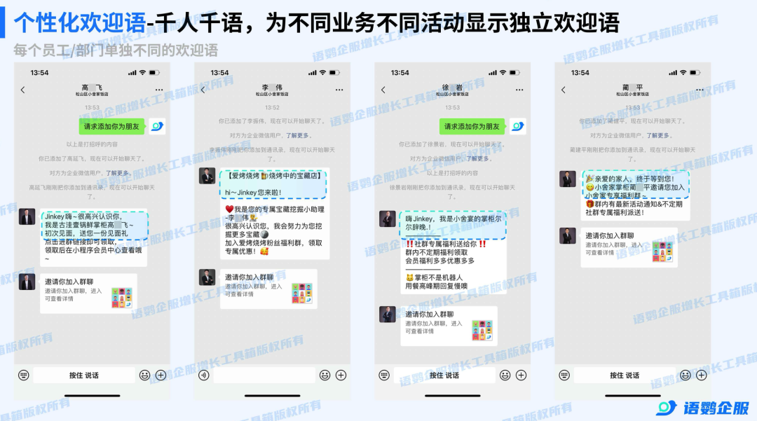 破冰的第一句话至关重要。很多门店的自动回复像冷冰冰的机器人,极易让顾客反感。比如当顾客扫码添加福利官企微,自动触发一条带有顾客昵称、专属服务员称呼以及新人专享代金券的欢迎消息。这种丝滑且充满人情味的体验,语鹦企服私域管家的个性化欢迎语就能轻松做到,不仅能千人千语,还能发送小程序卡片提升首单核销率。