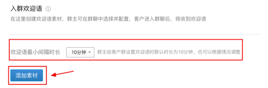 以电脑端的操作为例,企业登录企业微信管理后台,依次点击【客户联系】-【加客户】-【入群欢迎语】的【配置】进行欢迎语素材的添加。点击【配置】之后,我们就会进入以下页面,我们点击添加素材,即可进入入群欢迎语的预览页。