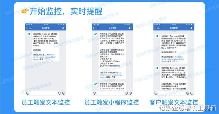 还可开启【敏感词监控】功能,支持文本、文件、小程序、名片等内容形式监控,无论是私聊还是群聊,一旦触碰敏感词,系统会即刻通知监管人,及时处理。